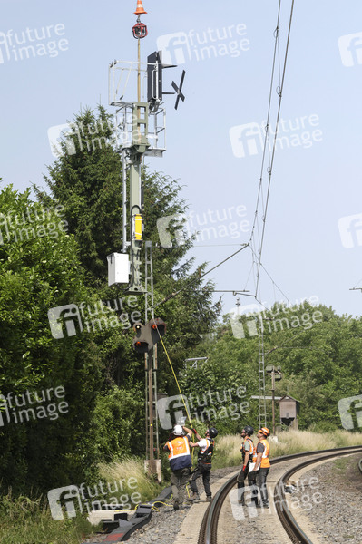 Bahnmitarbeiter bei der Signalinstallation beim Fototermin 'Helikopter fliegt Signalmaste für das neue Elektronische Stellwerk in Bonn-Beuel ein'. Es beginnt letzte große Bauphase vor der Generalsanierung der rechten Rheinstrecke im Jahr 2026. Mit Hilfe eines Helikopters werden knapp 50 Signalmaste für das neue ESTW Bonn-Beuel eingeflogen. Bonn, 14.06.2025