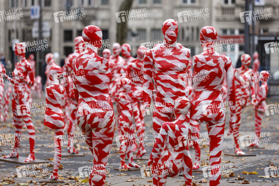Kunst-Installation 'It is like it is - Mahnmal zur Coronakrise - 2020', einer Installation aus 111 maskierten Schaufensterpuppen, von Dennis Josef Meseg anlässlich der strengen Maßnahmen der Bundesregierung wegen der Coronakrise auf dem Neumarkt. Köln, 11.11.2020