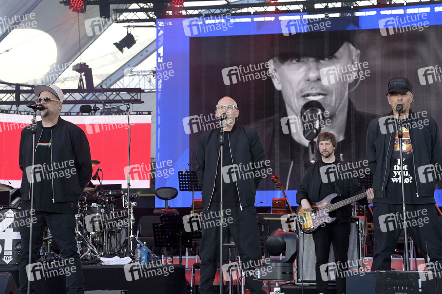 Smudo, Thomas D und Michi Beck von Die Fantastischen Vier live bei der Abschlussveranstaltung auf dem Demokratiefest zu 75 Jahren Grundgesetz auf der Bühne zwischen Kanzleramt und dem Deutschen Bundestag. Berlin, 26.05.2024