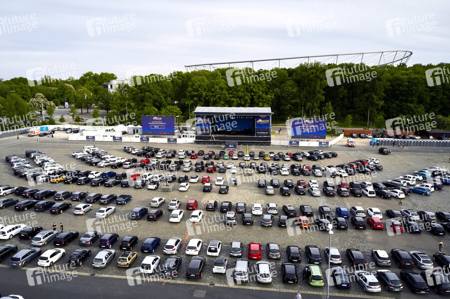 Zuschauer, Lufaufnahme, Luftbild, Auftritt, Bühne, Stage, live, Unterhaltung, Entertainment, Kultur, Corona, Sars-CoV-2, Covid-19, Coronavirus, Coronakrise, Corona-Krise, Corona-Pandemie, Coronamaßnahmen, Corona-Schutz, Kontaktverbot, Mindestabstand, Social Distancing, Abstand, Abstandhalten, Abstandsregel, Auto, Autokonzertreihe
