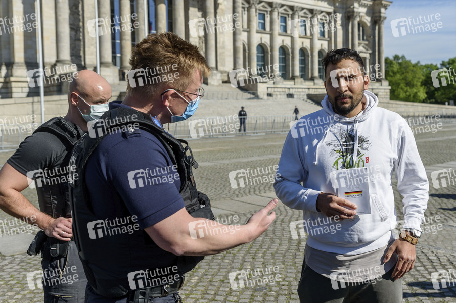Vegan-Koch Attila Klaus Peter Hildmann bei Interviews am vor dem von ihm initierten Spontanprotest von Gegnern der Corona-Beschränkungen auf der Reichtagswiese in Berlin-Mitte. Nachdem die Teilnehmerzahl immer größer wurde, erteilte die Polizei Platzverweise, denen nicht nachgekommen wurde. Schließlich wurde die Kundgebung durch die Polizei beendet und einige Personen festgenommen. Unter den Demonstranten befanden sich Rechsradikale, Hooligans, Impfgegner, QAnon-Anhänger und Verschwörungstheoretiker. Berlin, 06.05.2020