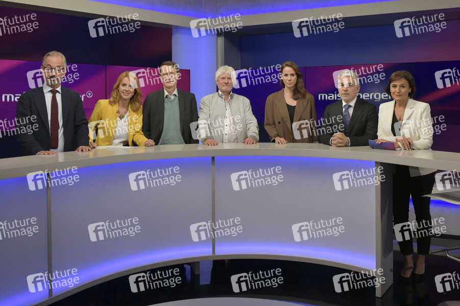 Jan Fleischhauer, Kerstin Palzer, Karl Lauterbach, Jürrgen Becker, Natalie Amiri, Carlo Masala und Sandra Maischberger in der ARD-Talkshow 'maischberger' im Studio Berlin Adlershof. Berlin, 07.10.2025