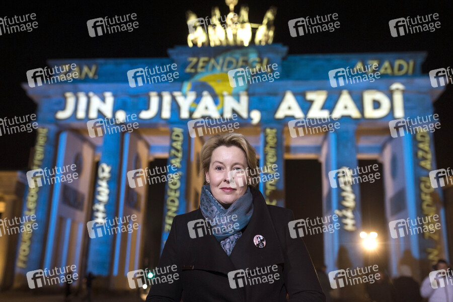 Franziska Giffey, Regierende Bürgermeisterin von Berlin, posiert vor dem Brandenburger Tor. Der Schriftzug 'Jin - Jiyan - Azadi' (Frau - Leben - Freiheit) erleuchtet am Brandenburger Tor aus Solidarität zu den Demonstrationen im Iran. Die Veranstaltung wurde organisiert von der Nichtregierungsorganisation HAWAR.help in Zusammenarbeit mit der Stadt Berlin. Berlin, 13.12.2022