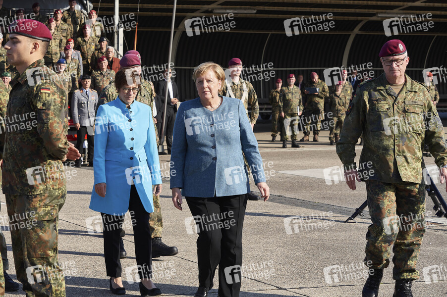 Verteidigungsministerin Annegret Kramp-Karrenbauer, Bundeskanzlerin Angela Merkel und General Eberhard Zorn bei einem Appell für die Soldatinnen und Soldaten der Evakuierungsmission in Kabul und dem Feierlichen Gelöbnis von Rekruten des Fallschirmjägerregiments 31 in der Fallschirmjägerkaserne Seedorf. Seedorf, 22.09.2021