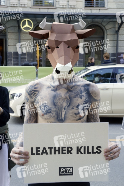 Demonstration der Tierschutzorganisation PETA gegen die Lederindustrie und die Verwendung von Leder in der Mode bei der Eröffung der MBFW bei der Berlin Fashion Week Spring/Summer 2023 vor dem Hotel Telegraphenamt. Berlin, 05.09.2022