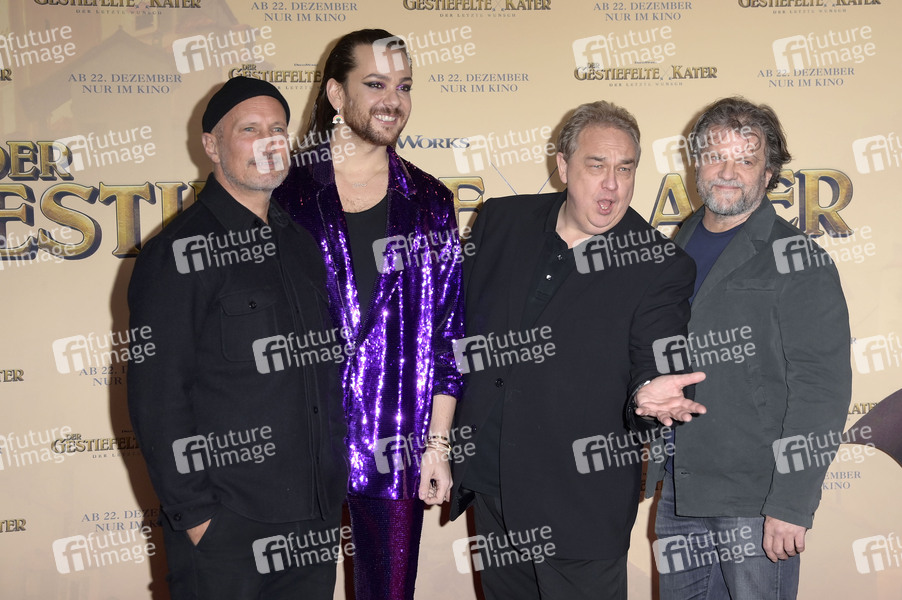 Benno Fürmann, Riccardo Simonetti, Oliver Kalkofe und Gast bei der Premiere des Kinofilms 'Der gestiefelte Kater: Der letzte Wunsch / Puss in Boots: The Last Wish' im Kino in der KulturBrauerei. Berlin, 11.12.2022