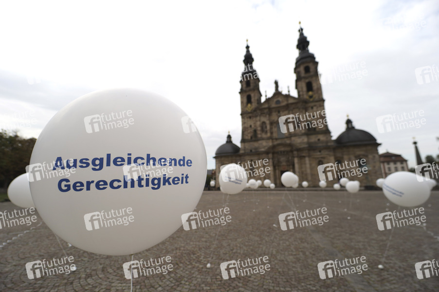 50 Luftballons, stellvertretend für die 5000 Missbrauchsopfer durch katholische Geistliche, die von der Selbsthilfe Rede/Münster auf dem Fuldaer Domplatz während der Herbst-Vollversammlung der Deutschen Bischofskonferenz aufgestellt wurden.. Fulda, 23.09.2020