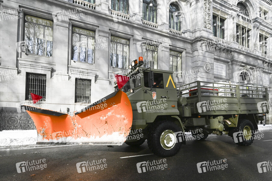 Schneepflug der Militärischen Nothilfeeinheit auf der Einkaufstraße Gran Vía - Die Region Madrid nach dem Sturmtief Filomena, das in weiten Teilen Spaniens mit starken Schneefällen für Chaos sorgte. Starker Schneefall legte das öffentliche Leben nahezu lahm. Seit 50 Jahren hatte es nicht so geschneit. Madrid, 10.01.2021