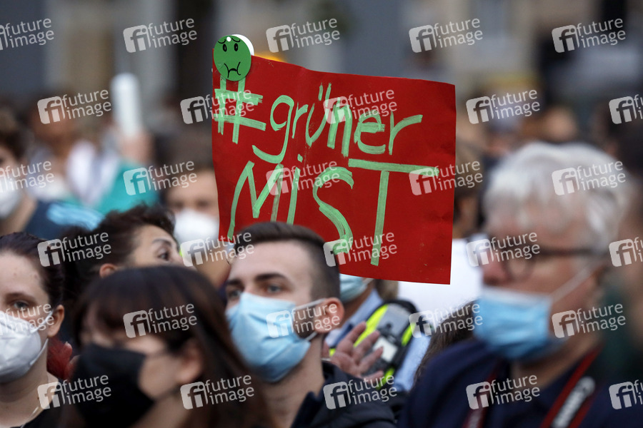 Politik, Rede, Wahl, Wahlkampf, Partei, Wahlkampfveranstaltung, Parteienwerbung, Kandidat, Kandidatin, Kampagne, Wahlen, Wahlkampagne, Wahlkampftour, Wahlkampfauftritt, Bundestagswahlkampf, Bundestagswahl, Bundestagswahlen, Politikerin, Grüne, Politikerin, Mitglied des Bundestags, Spitzenkandidatin, Bundesvorsitzende Bündnis 90/Die Grünen, Kanzlerkandidatin, MdB, Bärbock, Querdenker, Grüner Mist, Plakate, Gegendemo, Kritik am Young Global Leaders Programm von Klaus Schwab, Globalisierungsgegner, Grünen-Gegner, Protest
