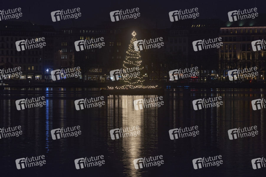 Die Alstertanne ragt rund 15 Meter in die Höhe und leuchtet dauf der Binnenalster bis Anfang Januar 2025 täglich von 5 bis 24 Uhr. Hamburg, 28.17.2024