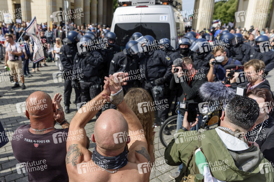 Coronaleugner, Verschwörungstheoretiker und rechte Gruppen der Initiative Querdenken protestieren mit einer Großdemonstration gegen die bestehenden Maßnahmen zur Eindämmung der Corona-Pandemie. Wegen Nichteinhaltung der polizeilichen Auflagen wurde die Demonstration durch die Polizei beendet. Berlin, 29.08.2020