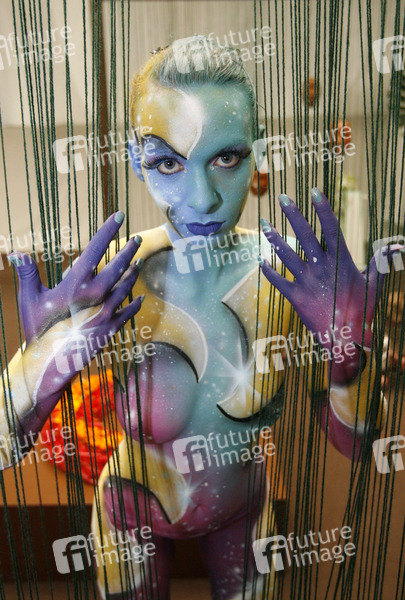 Bodypainting und Fotoshooting mit Model Sarah am Tag der offenen Tür der Meisterschule Justus-von-Liebig-Schule, Abteilung Floristik in Hannover-Ahlem. Künstler: Jörg Düsterwald