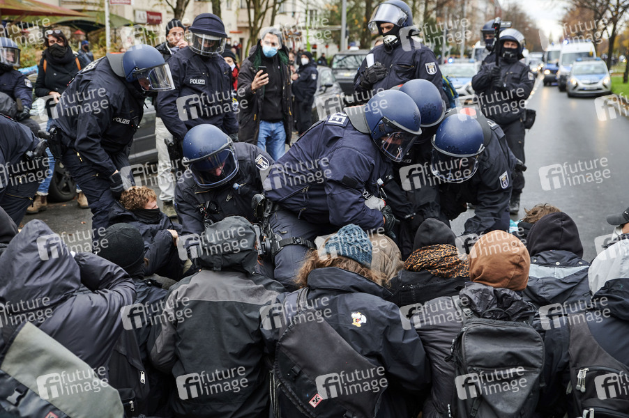 Linke Gruppen protestieren gegen eine Demonstration von Corona-Leugnern und Impfgegnern aus der Querdenken-Bewegung gegen die aktuellen Corona-Maßnahmen unter dem Motto 'Schweigemarsch gegen Diskriminierung und für Menschenrechte'. Der Demonstrationszug zieht durch den Berliner Stadtteil Prenzlauer zum Alexanderplatz. Berlin, 22.11.2020