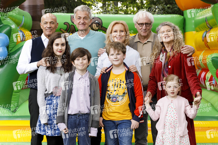 Heiner Lauterbach, Maya Lauterbach, Bruno Grüner, Dominic Raacke, Julius Weckauf, Maren Kroymann, Günther Maria Halmer, Barbara Sukowa und Luise Gleich beim Fototermin am Set des Kinofilms 'Enkel für Anfänger' am Dellbrücker Mauspfad. Köln, 30.04.2019