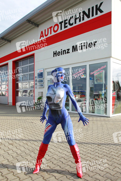 Werbefotos mit Model Caro für die Firma Autotechnik Heinz Müller in Elsdorf im Auftrag der Zoom Werbeagentur Bergheim. Bodypaint Künstler: Jörg Düsterwald