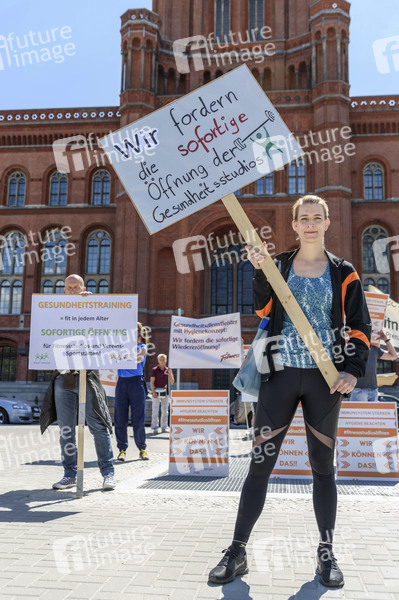 Betreiber von Sportstudios, Fitnessstudios und Yogastudios fordern mit einer Protestaktion vor dem Roten Rathaus die Wiedereröffnung ihrer Geschäfte, auch mit Auflagen. Aufgrund der Corona-Eindämmungsverordnung wurden Fitness- und Sportstudius in Berlin geschlossen. Berlin, 20.05.2020