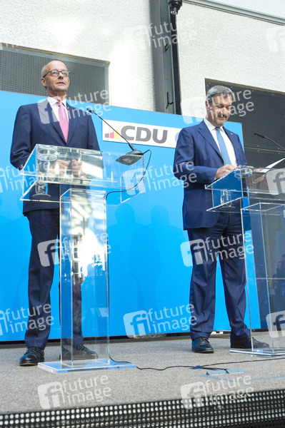 Friedrich Merz und Markus Söder bei einer gemeinsamen Pressekonferenz von CDU und CSU zur Kanzlerkandidatur der Union in der Vertretung des Freistaates Bayern beim Bund. Berlin, 17.09.2024