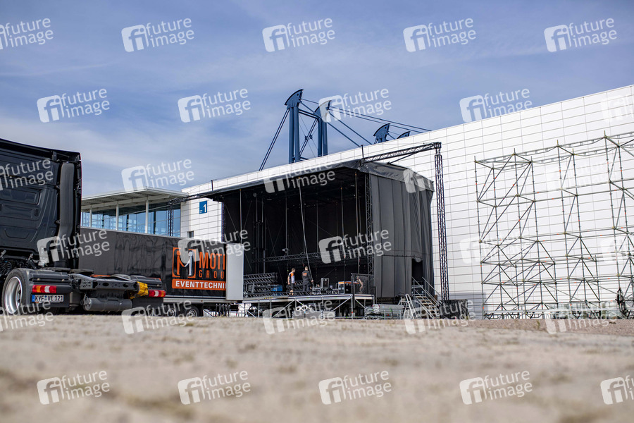 Die Bühne für die Autokonzert-Reihe an der Messe Erfurt wird aufgebaut. Die Eventreihe findet mit fünf Konzerten vom 20. bis 24. Mai 2020 statt. Erfurt, 18.05.2020