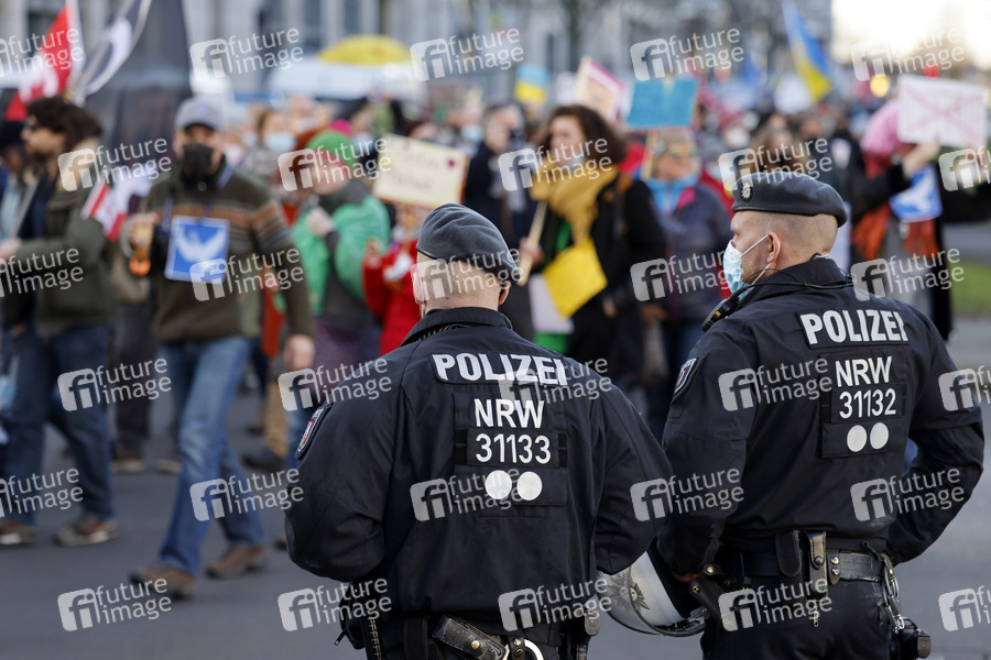 Polizisten beobachten den Umzug. Bei einer angemeldeten Demo unter dem Motto 'Freie Impfentscheidung, Herr Lauterbach!' demonstrierten Tausende Gegner einer Impfpflicht mit einem Spaziergang gegen die Corona-Maßnahmen der Bundesregierung und für eine individuelle Impfentscheidung, Grundrechte und 'unversehrte' Kinder - darunter auch viele Pflegekräfte, die wegen der Impfpflicht im Gesundheitsbereich ihren Job zu verlieren drohen. Düsseldorf, 26.02.2022