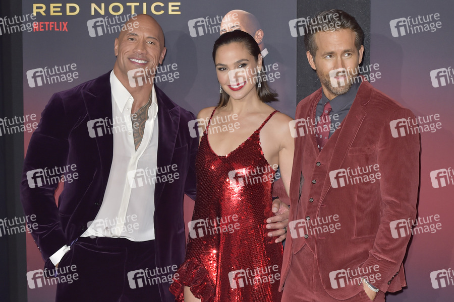 Dwayne Johnson, Gal Gadot und Ryan Reynolds bei der Weltpremiere des Netflix-Films 'Red Notice' im L.A. Live. Los Angeles, 03.11.2021