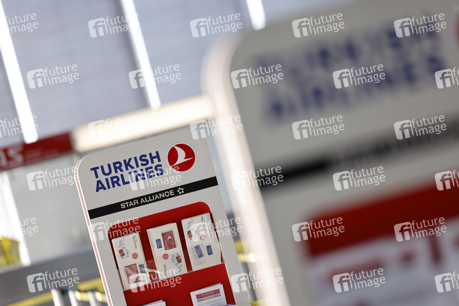 Ein Aufsteller mit dem Logo der Fluglinie Turkish Airlines am Köln Bonn Airport. Der Flughafen Köln/Bonn 'Konrad Adenauer' ist ein internationaler Verkehrsflughafen in Köln. (Themenbild, Symbolbild) Köln, 23.02.2022