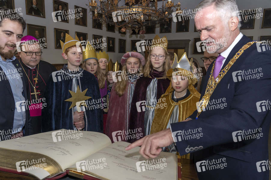 Bischof Franz-Josef Bode, Sternsinger und Oberbürgermeister Wolfgang Griesert beim Eintrag ins Goldene Buch der Stadt Osnabrück bei der bundesweiten Eröffnung der 62. Aktion Dreikönigssingen unter dem Motto 'Segen bringen, Segen sein. Frieden! Im Libanon und weltweit' im Rathaus. Osnabrück, 28.12.2019