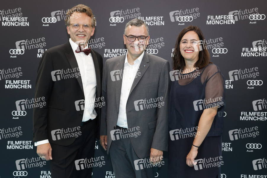 Christoph Gröner, Florian Herrmann und Julia Weigl bei der Festivaleröffnung mit der Premiere des Kinofilms 'Zwei zu eins' auf dem 41. Filmfest München 2024 im Gasteig HP8. München, 29.06.2024