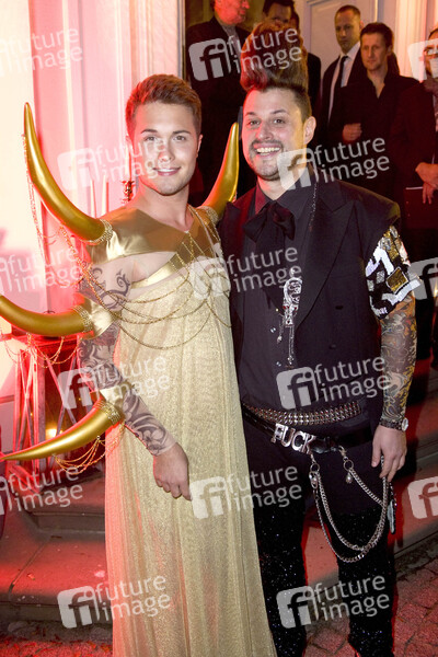 Maxim Grund und Matthias Maus beim Kunstevent zum offiziellen Verkaufsstart der Kollektion 'Glööckler Art by Borelly' mit einer Installation der Berliner Mauer und zu Kunstobjekten stilisierten Panzern im Schloss Friedrichsfelde. Berlin, 23.10.2013