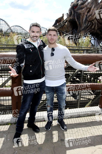 Menderes Bagci und Joey Heindle beim Fototermin an der Holzachterbahn Colossos im Heide Park Resort. Soltau, 14.05.2019