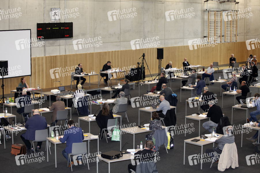 Öffentliche Sitzung des Görlitzer Stadtrats nach Corona-Schutzverordnung in der Sporthalle Emil-von-Schenckendorff. Görlitz, 30.04.2020