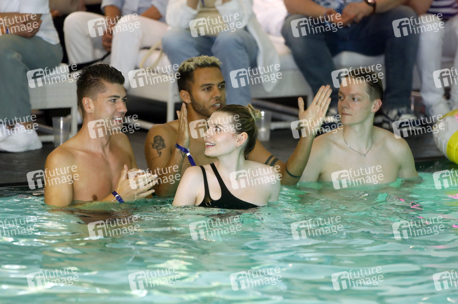 Maximilian Seitz, Malik Harris, Eva Bloss und Emily Port beim Charity Promi Swim Event 2025 von Maximilian Seitz zugunsten von 'Kindeswohl-Berlin' im Hotel Pullman Berlin Schweizerhof. Berlin, 24.07.2025