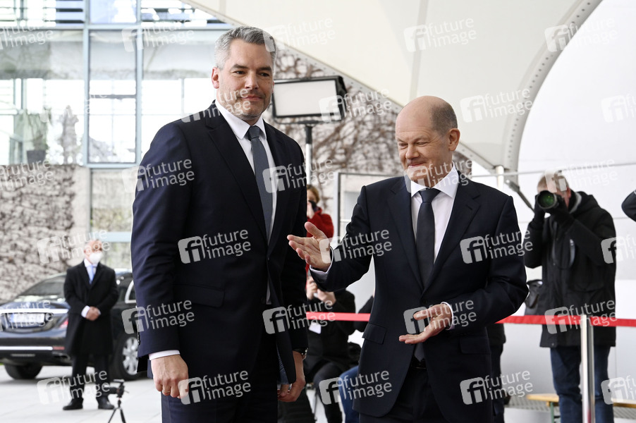 Karl Nehammer und Olaf Scholz beim Empfang des Bundeskanzlers der Republik Österreich mit militärischen Ehren im Bundeskanzleramt. Berlin, 31.03.2022