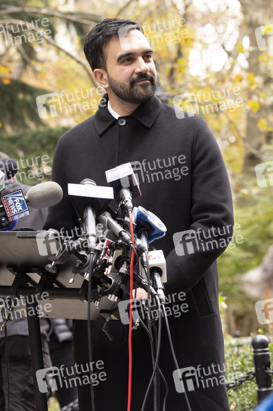 Zohran Mamdani bei einer Pressekonferenz im City Hall Park zu einem bevorstehenden Treffen mit dem US-Präsidenten in Weißen Haus. New York, 20.11.2025