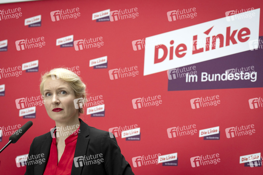 Ines Schwerdtner bei einem Pressestatement der Partei Die Linke im Reichstagsgebäude. Berlin, 12.03.2025