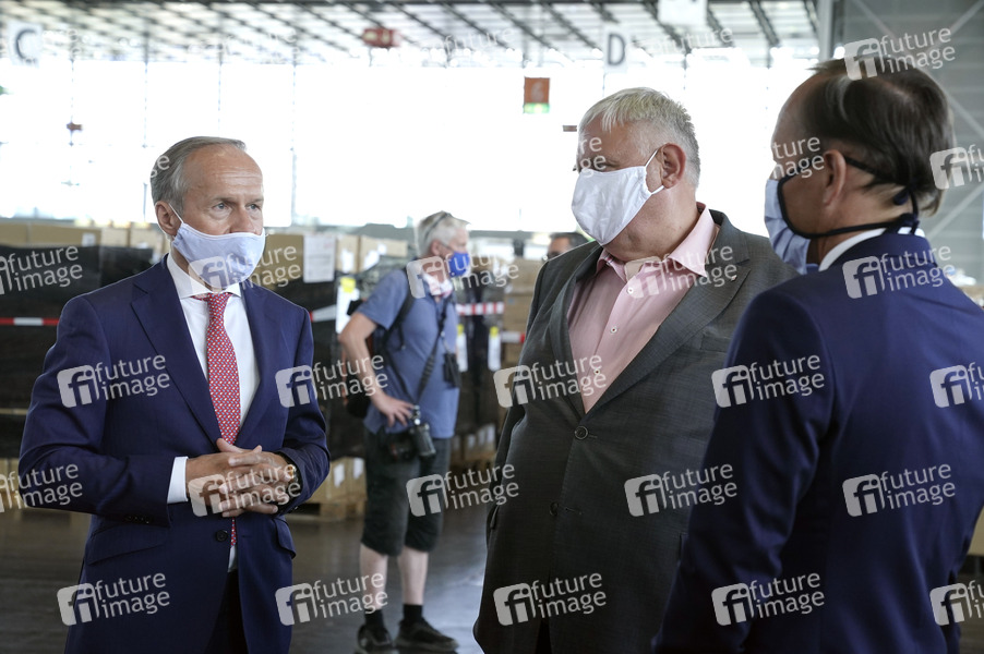 Christian von Daniels (Inhaber van Laack), Karl-Josef Laumann (NRW-Gesundheitsminister) und Thomas Wessel (Vorstandsmitglied und Arbeitsdirektor Evonik Industries AG) beim Besuch im Landeslager für Schutzausrüstung an der Messe. Düsseldorf, 03.06.2020