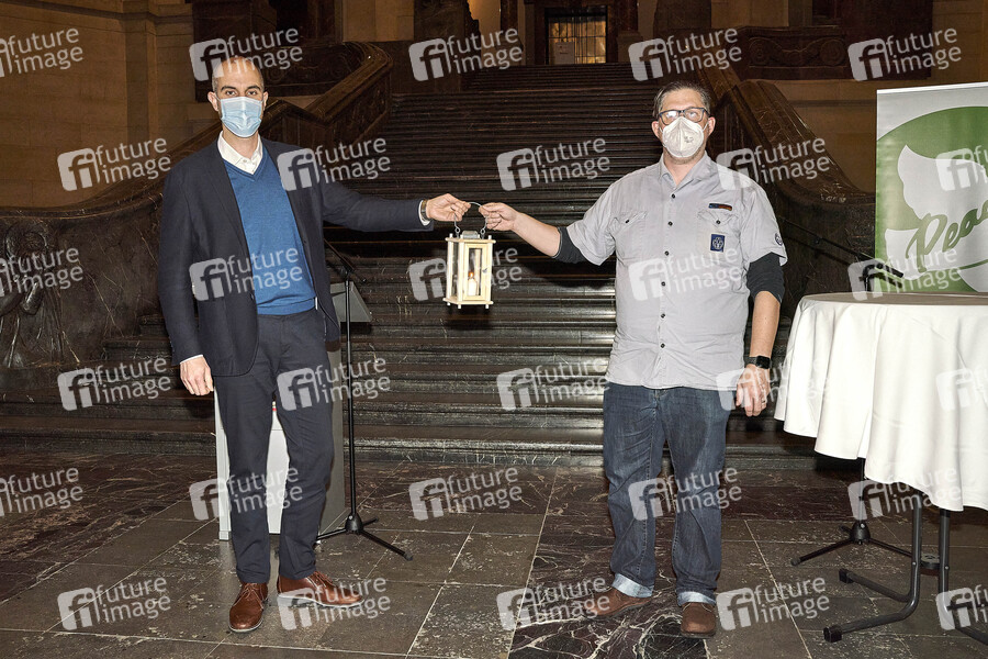 Oberbürgermeister Belit Onay nimmt im Neuen Rathaus von Lars Mesch das Friedenslicht aus Bethlehem entgegen. Hannover, 15.12.2020