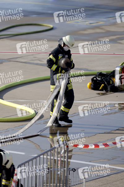 Einsatzkräftei der gemeinsamen ICAO-Notfallübung der Werkfeuerwehr, der Feuerwehr Köln, THW, Landespolizei, Bundespolizei und Bundeswehr am Köln Bonn Airport. Im Rahmen der Übung wird die Kollision eines Flugzeugs mit einem Passagierbus und einer Abfertigungshalle simuliert. Einsatzkräfte retten Verletzte aus dem in Brand geratenen Flugzeug. Köln, 06.11.2021