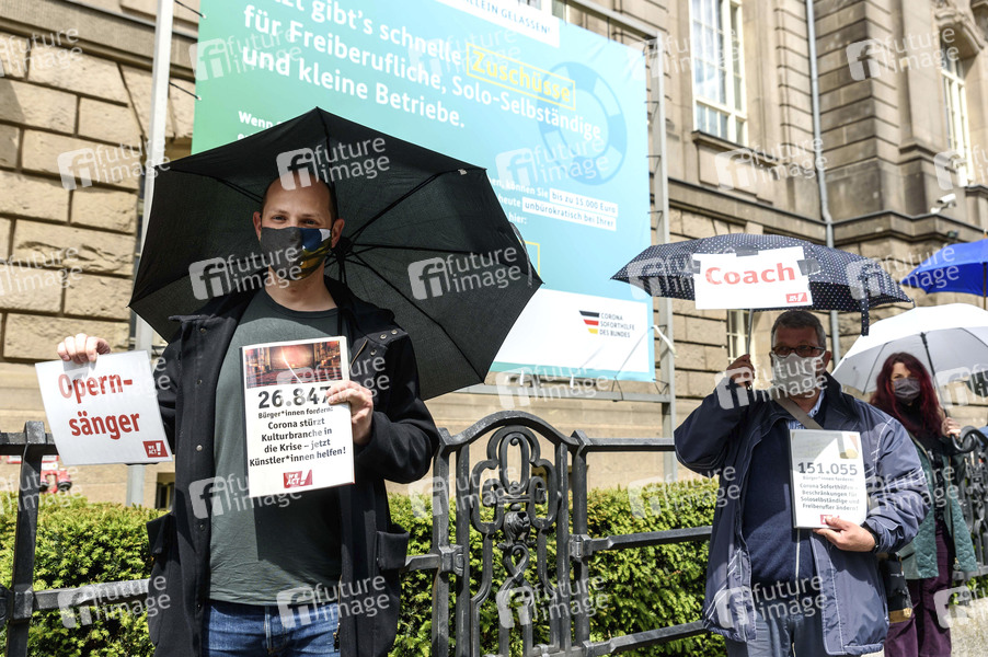 Gemeinsam mit Campact demonstrieren Solo-Selbstständige, Freiberufler und Künstler vor dem Bundeswirtschaftsministerium in Berlin gegen die 'Löcher' im Rettungsschirm. Mit einer Unterschriftenaktion fordern sie die Aufstockung der Hilfsgelder und die Möglichkeit, die Soforthilfen auch für den Lebensunterhalt verwenden zu dürfen. Berlin, 14.05.2020