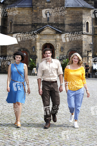 Liza Tzschirner, Philipp Danne und Eva-Maria Grein von Friedl am Set des ARD-Fernsehfilms 'Der Ranger - Paradies Heimat' auf dem Marktplatz. Stadt Wehlen, 14.08.2019
