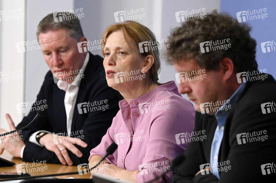 Stefan Glaser, Karin Prien und Janosch Littig bei der Pressekonferenz Jahresbericht 2024 von jugendschutz.net 'Sexualisierte Gewalt und Hass: Risiken für Kinder und Jugendliche im Netz' im Haus der Bundespressekonferenz. Berlin, 20.05.2025