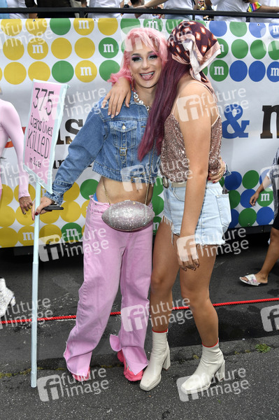 Candy Crash und Leni Bolt vor dem M&M's Truck bei der 44. Christopher Street Day Parade 2022 unter dem Motto 'United in Love! Gegen Hass, Krieg und Diskriminierung' vom Spittelmarkt auf gut sieben Kilometern über Potsdamer Platz und Potsdamer Straße zum Nollendorfplatz, von dort weiter zur Siegessäule und zum Brandenburger Tor. Berlin, 23.07.2022