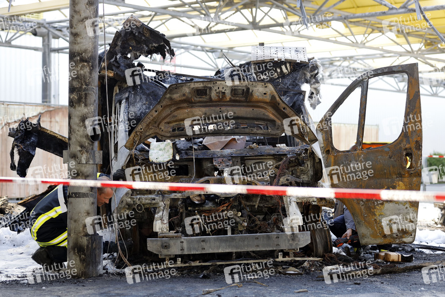 Willi Herrens Reibekuchen-Foodtruck ist auf dem Parkplatz des Großmarkts Selgros abgebrannt. Die Feuerwehr untersucht das Wrack. Warum der Foodtruck abgebrannt ist, muss noch ermittelt werden. Willi Herren war am 20. April tot in seiner Wohnung in Köln gefunden worden. Den Foodtruck hatte er erst wenige Tage vor seinem Tod eröffnet. Frechen, 03.05.2021