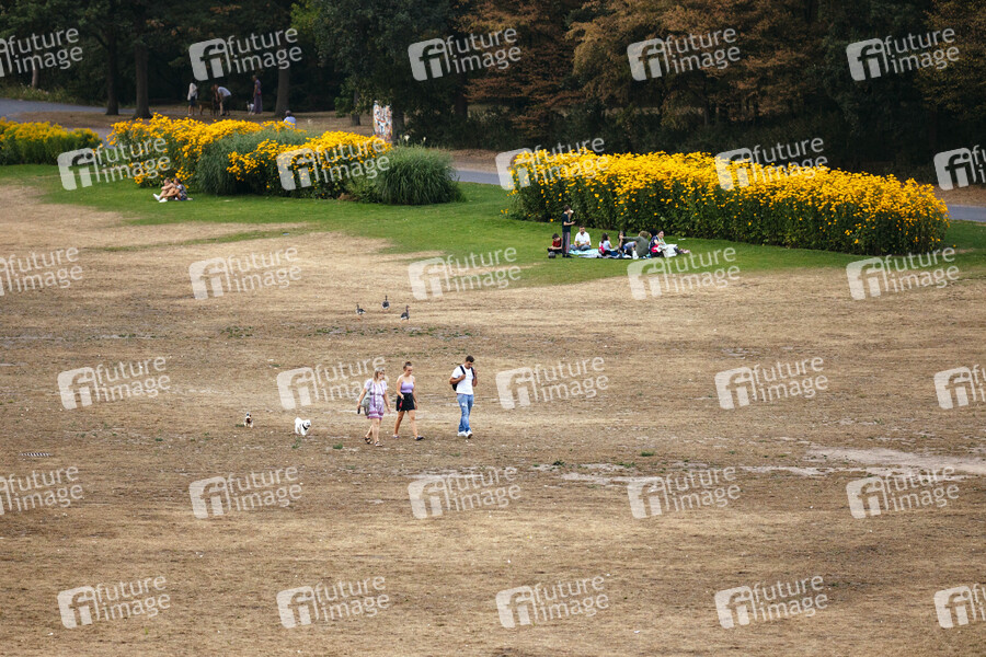 Die sommerliche Hitze und der Regenmangel haben weite Teile der Parkanlagen in der Bonner Rheinaue verdorren lassen und für erhebliche Rasenschäden gesorgt. Bonn, 14.08.2020