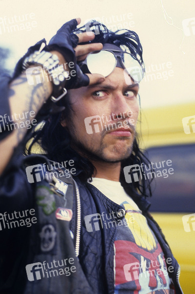 Mark 'Zodiac Mindwarp' Manning von Zodiac Mindwarp and the Love Reaction auf dem Reading Rock Festival 1986 an der Richfield Avenue. Reading, 24..08.1986