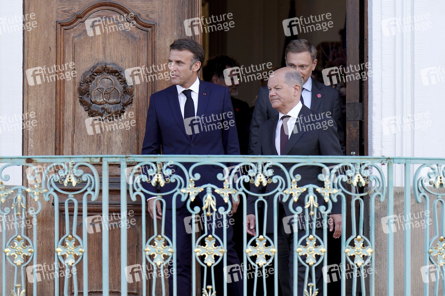 Emmanuel Macron und Olaf Scholz beim Treffen des Deutsch-Französischen Ministerrats im Gästehaus der Bundesregierung Schloss Meseberg. Meseberg, 28.05.2024