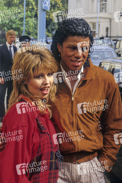 Pia Zadora und Jermaine Jackson beim Photocall vor einem Hotel. London, 10.09.1984
