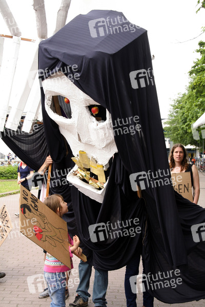 Demonstration am Neptunbrunnen gegen die Firma Monsanto, gegen das TTIP und für den Erhalt des ehemaligen Berliner Flughafens Tempelhof als unbebauter Freizeitpark. Berlin, 24.05.2014