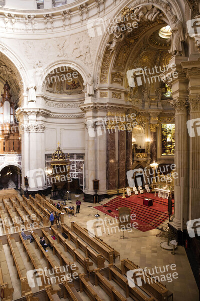 Im Berliner Dom wird der Festgottesdienst am Ostersonntag gefeiert. Durch die Kontaktbeschränkungen wegen Corona wird der Gottesdienst ohne Besucher abgehalten und im Internet gestreamt. Die Domprediger Petra Zimmermann, Michael Kösling, Thomas Müller und Maximilian Ilgner halten den Gottesdienst ab. Berlin, 12.04.2020