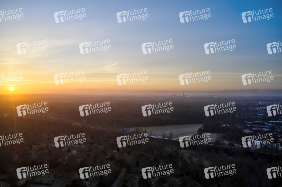 Luftbild Sonne (Aufgang 6:51 Uhr) und Mond (Aufgang 4:51 Uhr) treffen am Himmel zusammen. Hannover, 08.03.2021