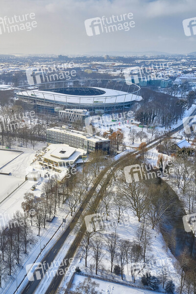 verschneit, Schnee, Glätte, Eis, kalt, Wintereinbruch, Eisregen, Minustemperaturen, Winter, Winterwetter, Grenzwetterlage, Schneefälle, Schneefall, Frost, Wetterlage, Luftaufnahme, Drohne, Drohnenfoto, Drohnenaufnahme, Drohnenbild, HDI Arena